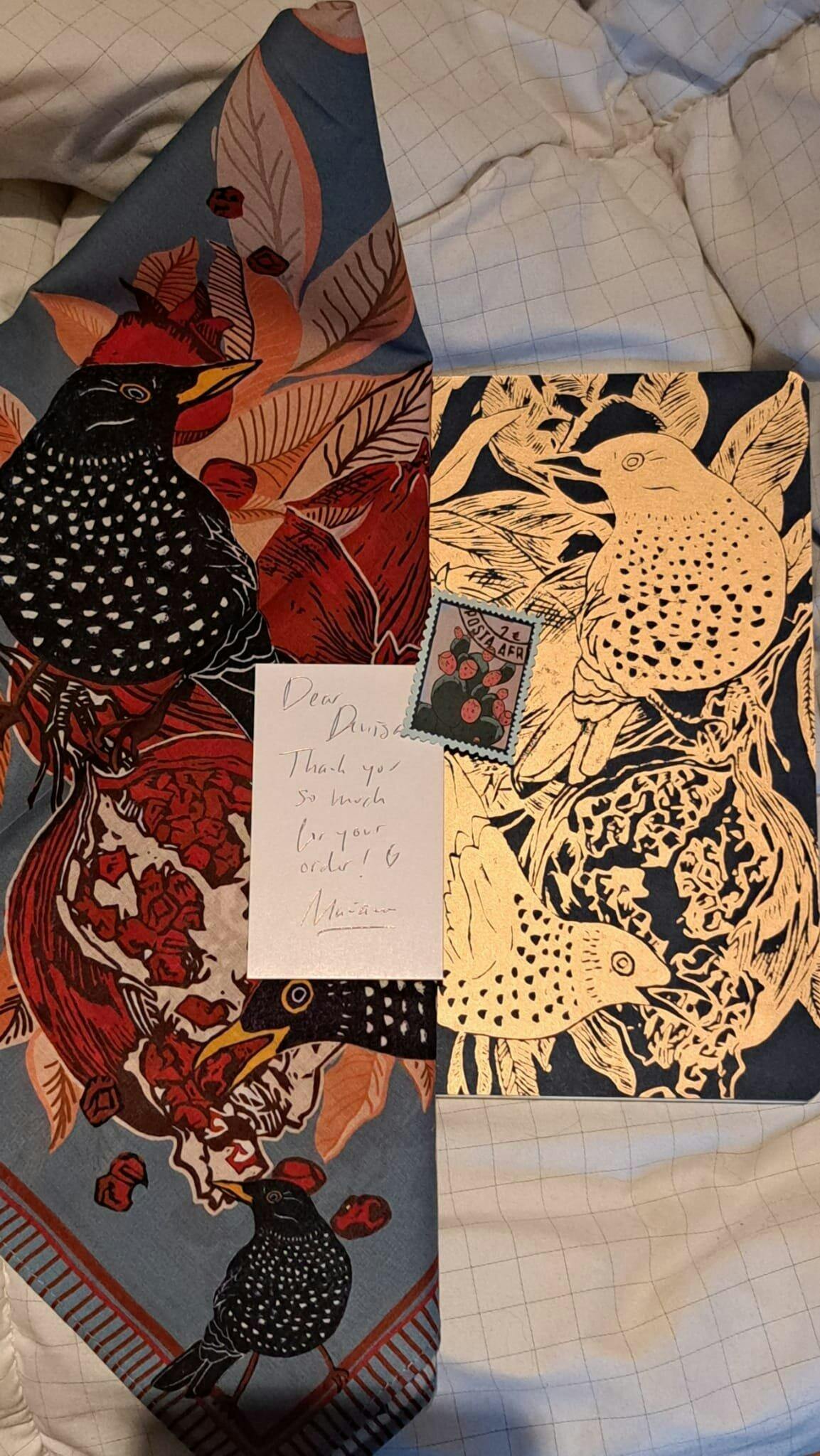 I bought a bandana with birds and the notebook with the same . They are very beautiful and high quality. Can't wait to wear it or to use the notebook.