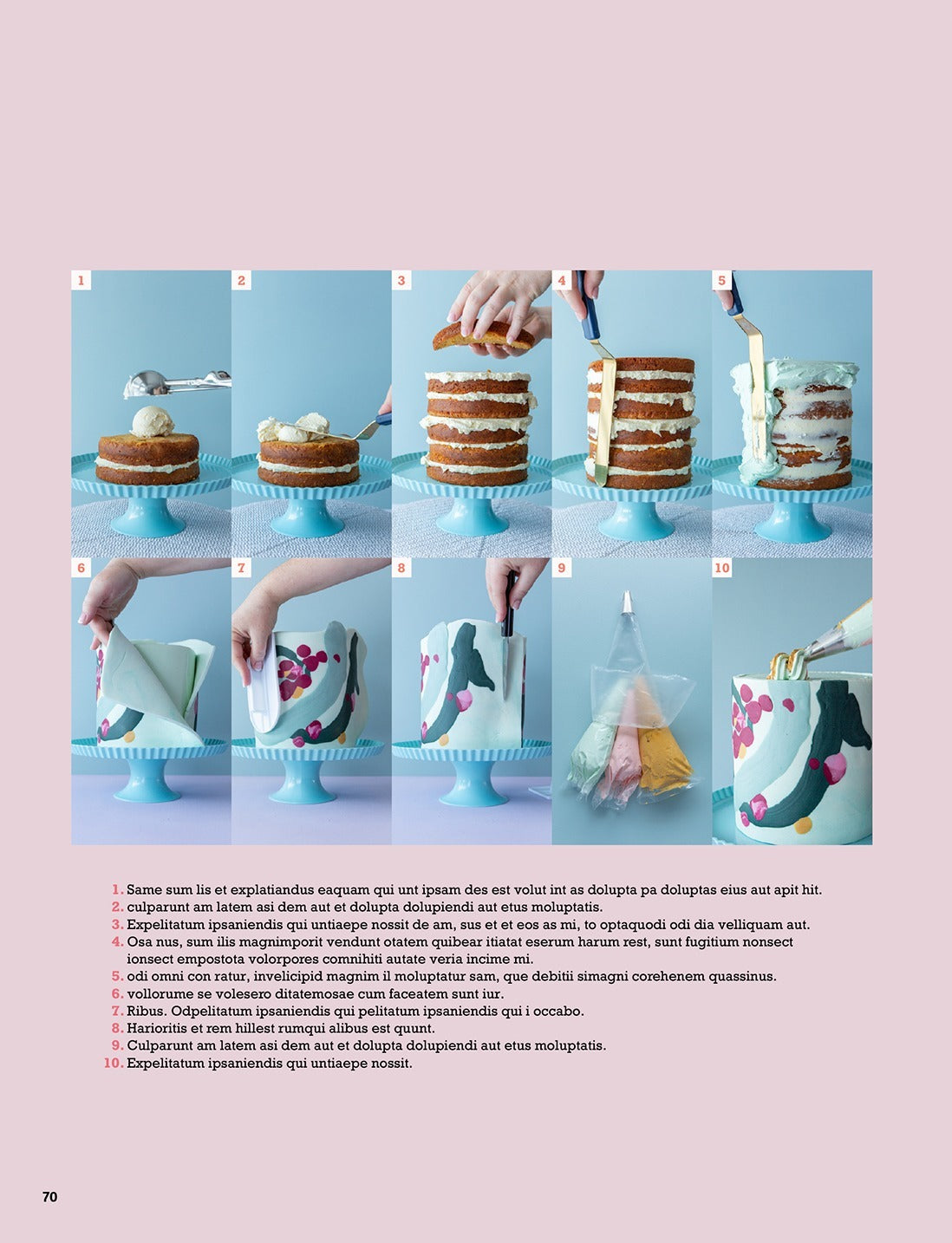 elements such as sprinkles, meringue and marshmallows. Tall cakes with
